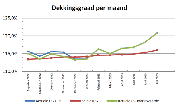 De actuele dekkingsgraad van ons pensioenfonds is eind juli 2023: 120,9% (mei: 118,3%). De beleidsdekkingsgraad is 116,0%. De beleidsdekkingsgraad is de gemiddelde dekkingsgraad over de afgelopen 12 maanden.