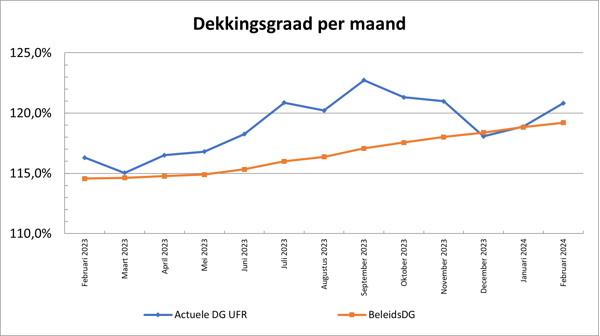 De actuele dekkingsgraad van ons pensioenfonds is eind februari 2024: 120,8% (januari 2024: 118,9%). De beleidsdekkingsgraad is 119,2%. De beleidsdekkingsgraad is de gemiddelde dekkingsgraad over de afgelopen 12 maanden.